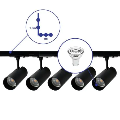 Bright Choice Complete Set 1-Phase Rail L 1 x 1,5 Meter Black | incl. 5x Spot + GU10 2700K 3W Dimmable + End Cap, Power Connector and L -Connector