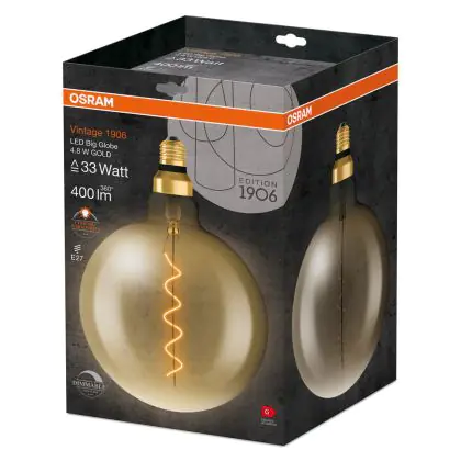 Osram Vintage 1906 LED E27 Globe Filament Gold 200mm 4.8W 400lm - 822 Extra Warm White | Dimmable